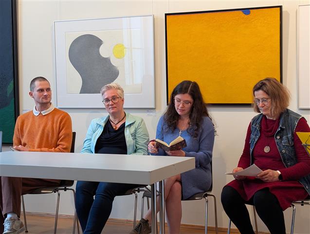 Annalena Vasters liest. Links neben ihr Kerstin Reichenbach und Maximilian Dürr, rechts Heidi Büttner |