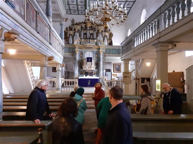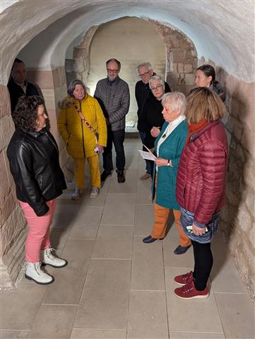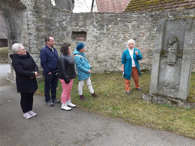 | Iris Friebel führt Werkstatt-Teilnehmer durch die einstige Kaiserpfalz Michaeliskirche Rohr, hier am Denkmal des Bildhauers Herbert König. |