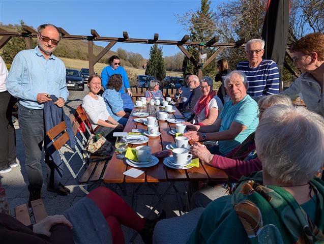 Werkstatt-Start mit Kaffee im Biergarten vorm Haus |