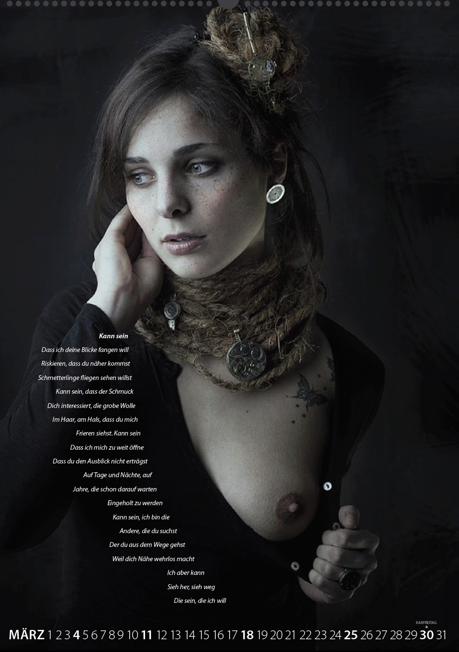 KANN SEIN Dass ich deine Blicke fangen will Riskieren, dass du näher kommst Schmetterlinge fliegen sehen willst Kann sein, dass der Schmuck Dich interessiert, die grobe Wolle Im Haar, am Hals, dass du mich Frieren siehst. Kann sein Dass ich mich zu weit öffne Dass du den Ausblick nicht erträgst Auf Tage und Nächte, auf Jahre, die schon darauf warten Eingeholt zu werden Kann sein, ich bin die Andere, die du suchst Der du aus dem Wege gehst Weil dich Nähe wehrlos macht Ich aber kann Sieh her, sieh weg Die sein, die ich will |