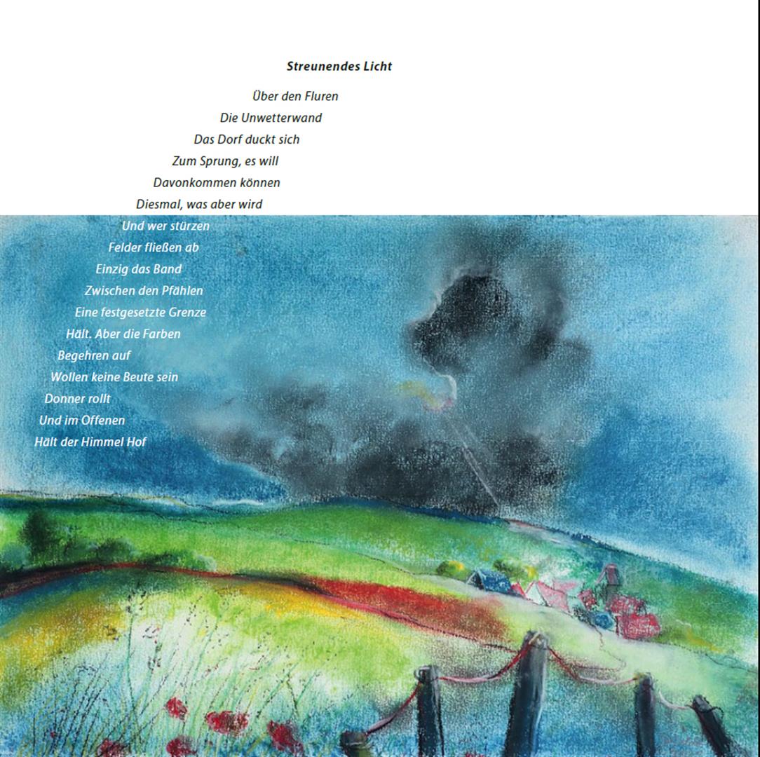 Über den Fluren Die Unwetterwand Das Dorf duckt sich Zum Sprung, es will Davonkommen können Diesmal, was aber wird Und wer stürzen Felder fließen ab Einzig das Band Zwischen den Pfählen Eine festgesetzte Grenze Hält. Aber die Farben Begehren auf Wollen keine Beute sein Donner rollt Und im Offenen Hält der Himmel Hof
