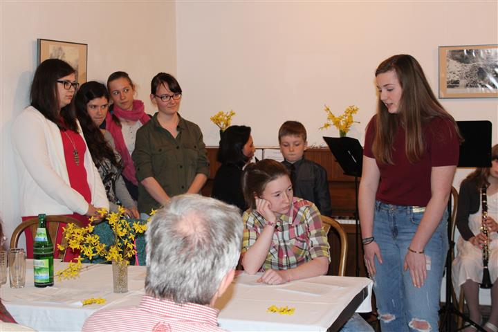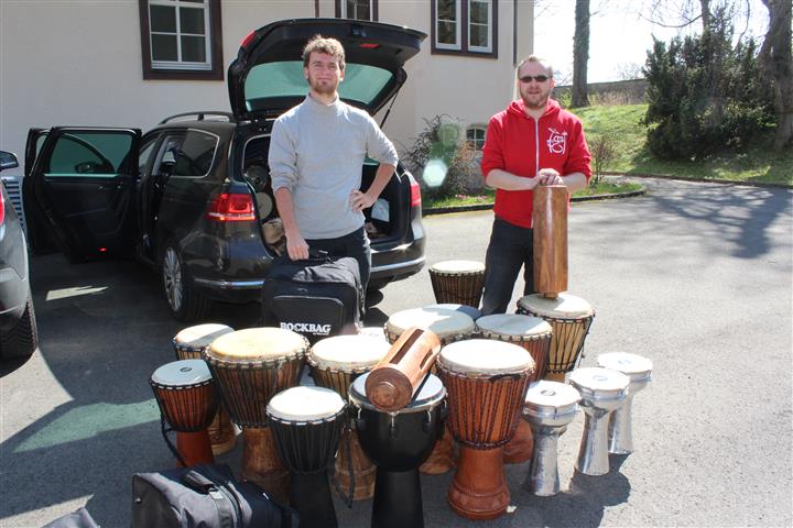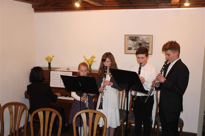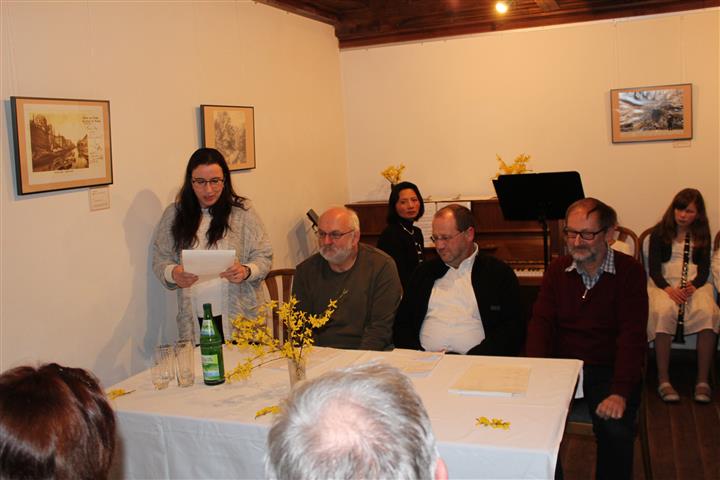 | Die Abschlusslesung im Baumbachhaus fand vor voll besetztem Hause statt. Die musikalische Begleitung oblag diesmal Klarinettenschülern der Meininger Musikschule unter Leitung von Wen-Chen Theile (Bild unten). Die Werkstatttage wurden am Sonntag abgerundet durch den Teil 2 des im Vorjahr begonnenen Trommel-Workshops unter Leitung von Maximilian Strobel und Sören Georgy (untere Bildzeile rechts). Der in diesem Jahr zeitige Frühling in der Rhön und das Engagement aller Beteiligten ließen das literarische Wochenende wieder zu einem Höhepunkt im Vereinsjahr und im literarischen Leben der Region werden. |  | |