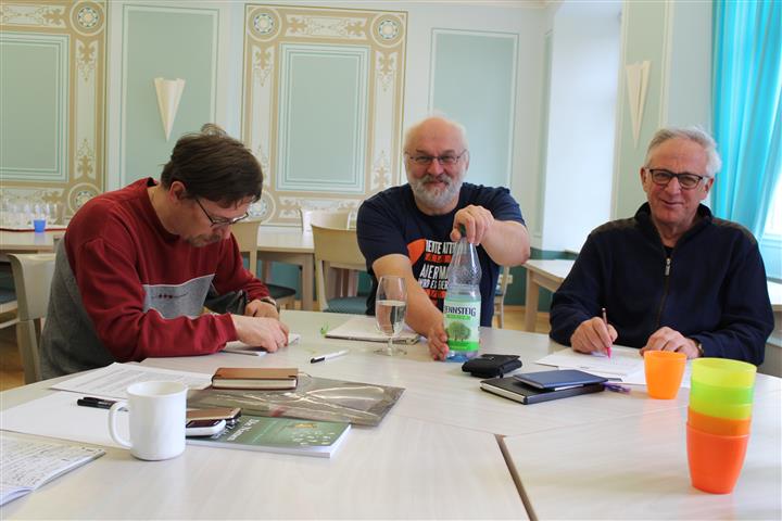 | Erneut kamen Anfang April 2017 insgesamt 23 Schreibende der Region nach Hümpfershausen in die Rhön, um an der 28. Südthüringer Literaturwerkstatt teilzunehmen. Das Jugendausbildungszentrum (JABZ) der Thüringer Feuerwehr im Schloss Sinnershausen bot dafür wieder beste Bedingungen. In drei Gruppen wurde an mitgebrachten Texten gearbeitet. Vor Ort entstanden neue literarische Texte. Die Bilder links und rechts zeigen die Jugendgruppe bei ihrem Auftritt im Literaturmuseum Baumbachhaus Meiningen am Samstagabend, dem 8. April. Der Workshop wurde gefördert von der Staatskanzlei des Freistaat Thüringen, der Rhön-Rennsteig-Sparkasse und der Stadt Suhl.. |